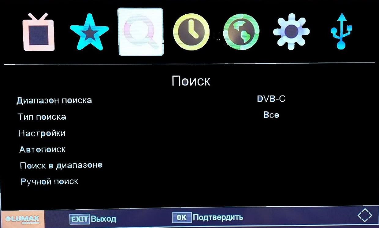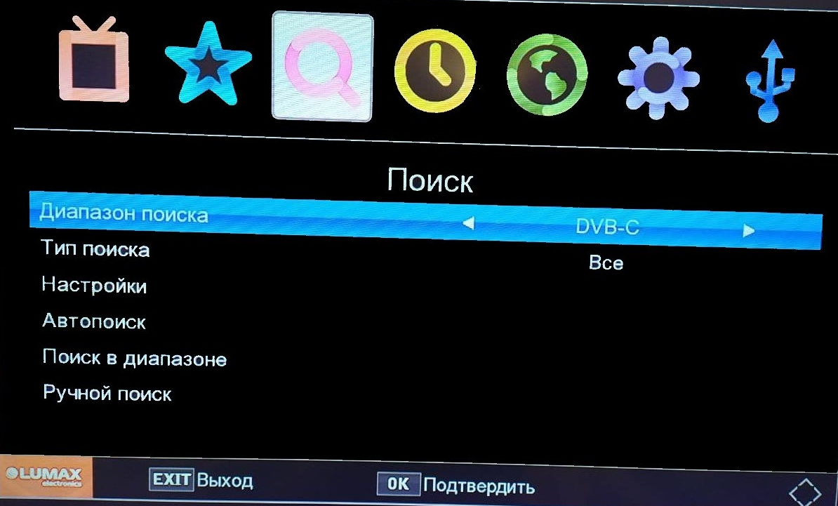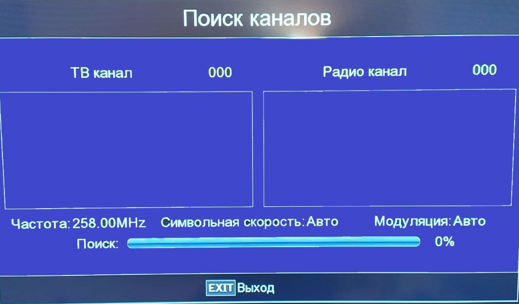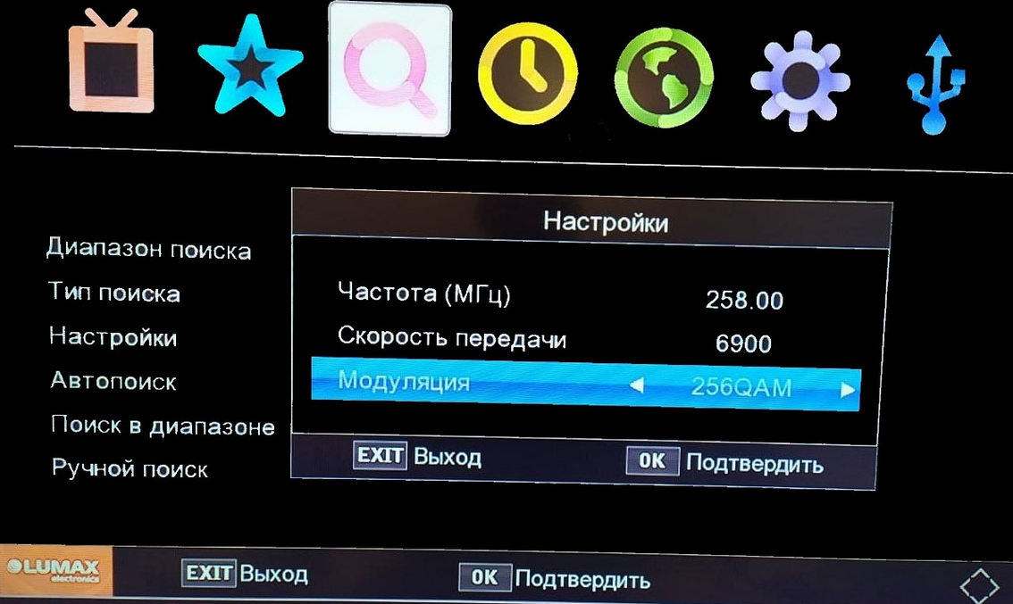 Модуляция: 256QAM (выбор значения производится кнопкой «<» или «>»)
