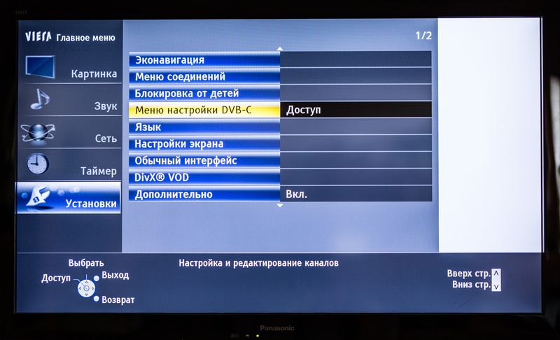 2. В появившемся меню, выберите вкладку УСТАНОВКИ. На этой вкладке выбираем пункт МЕНЮ НАСТРОЙКИ DVB-C, нажимаем кнопку ОК.