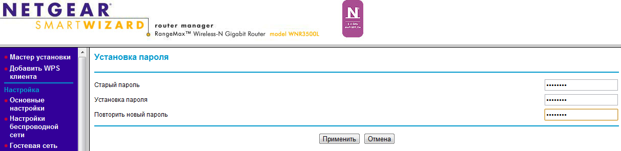 Заполняем текущий пароль (по умолчанию – «password»), далее устанавливаем новый пароль и его подтверрждение.